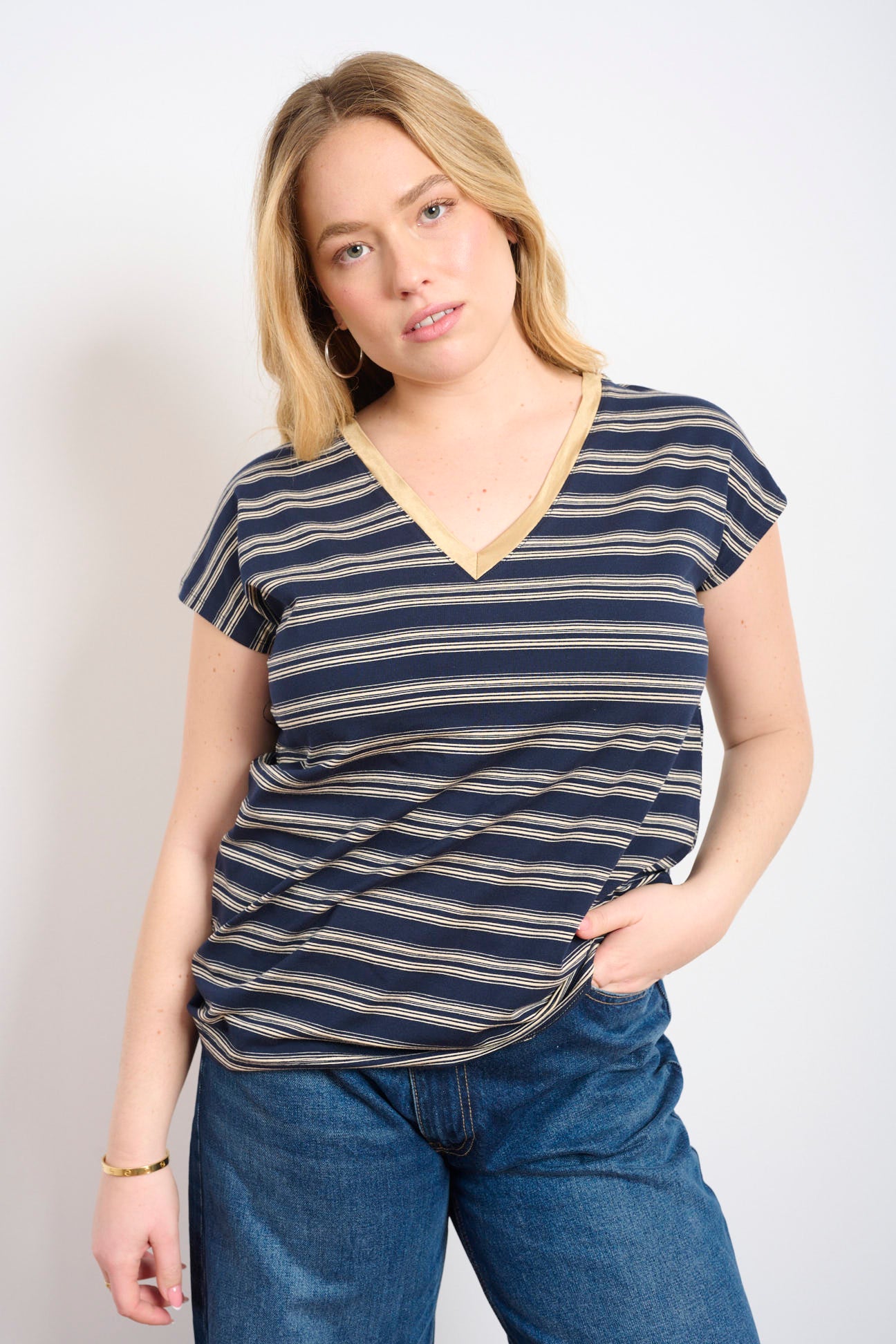 טי שירט פסים קלאסית עם מפתח וי מושלם – נוחה, קלילה ומדויקת ליומיום בלי להתאמץ